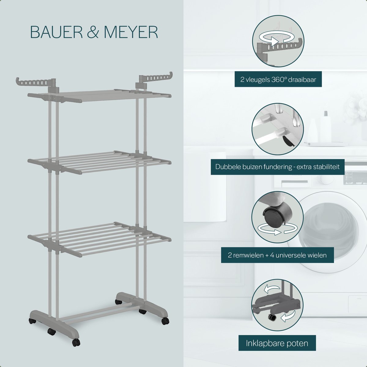 Het BAUER & MEYER® wasrek is zeer stevig, inklapbaar en eenvoudig te monteren!