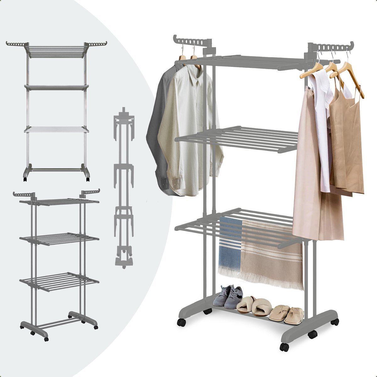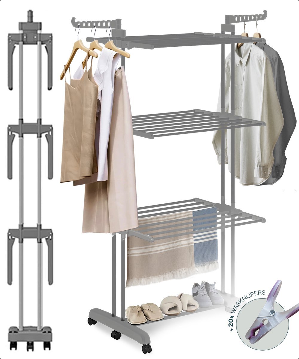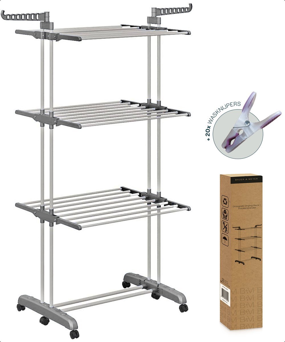 BAUER & MEYER® – Droogrek – Inklapbaar Wasrek – Incl. 20 wasknijpers – Droogtoren – Wastoren – 173 x 75 x 63 cm – Grijs