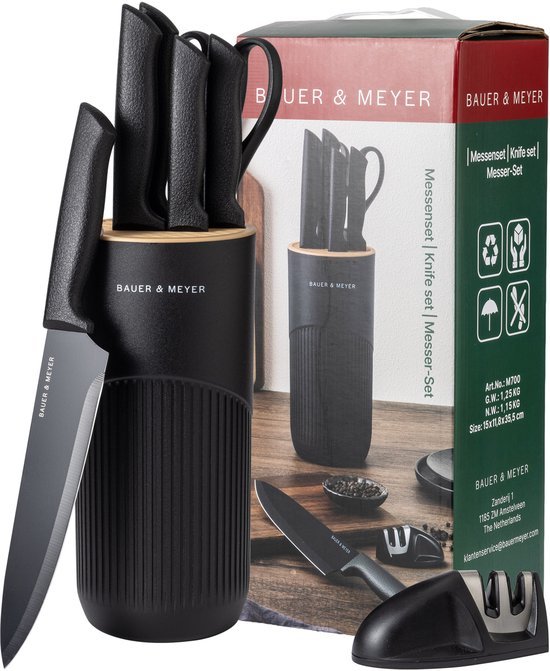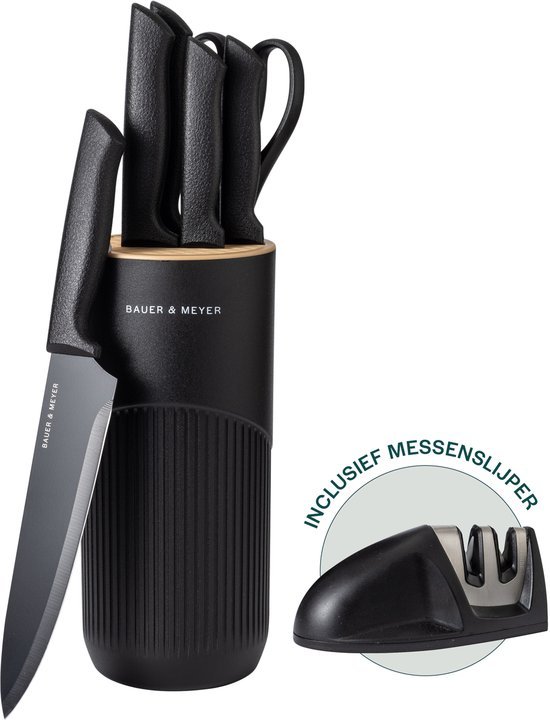 BAUER & MEYER® Messenset – Messenblok – 8-delig – Incl. messenslijper – Keukenmessen – Keukengerei – Zwart