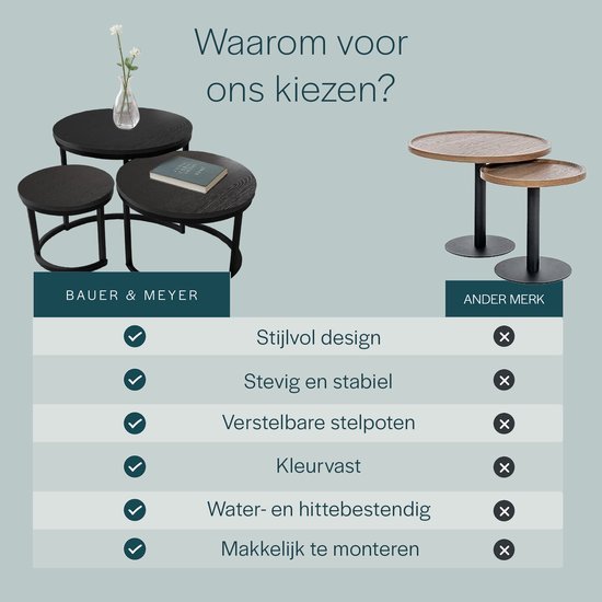 Hoe we dit willen bereiken? Door te werken met professionele en gerenomeerde fabrikanten wereldwijd, inkopen van grote aantallen (en dus schaalvoordelen behalen) en kwaliteitscontroles uit te voeren gedurende productie en bij afloop. Het merk BAUER & MEYER® levert kwalitatieve producten, met focus op veiligheid, duurzaamheid zonder het hoge prijskaartje. Bestel vandaag nog jouw salontafel set!